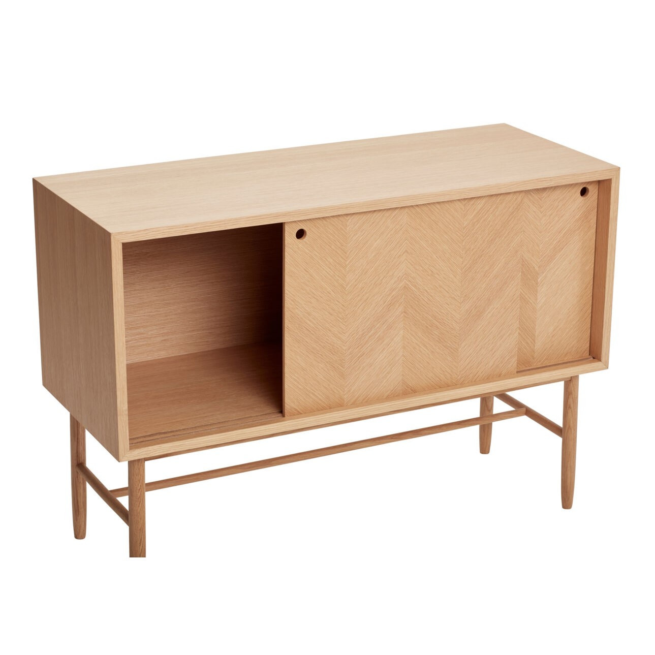Dubová komoda v teplém, skandinávském stylu. Jednoduchý tvar, velmi elegantní a praktický. Komoda má posuvná dvířka a charakteristický vzor rybí kosti na čelech dvířek. Díky ekonomické formě inspirované skandinávským designem skvěle zařídí prostor jídelny i obývacího pokoje.