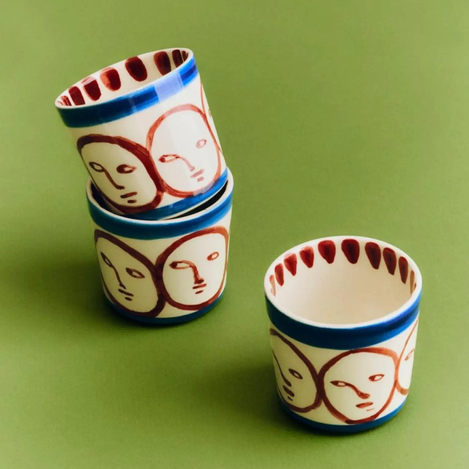 Každý kus jeručně malovanýDíky czEmu nejsou žádné dva stejné kusy. Model La Faccia("obličej") zaujme organickým motivem v živé, kontrastní paletě barev kombinující odstíny modré, zelené a jemné zemité Ton odstíny na krémovém pozadí. Kapacita240 mlje hrnek perfektní na kávu, čaj nebo horkou čokoládu a zároveň může být dekorativním akcentem na poličce nebo stole.