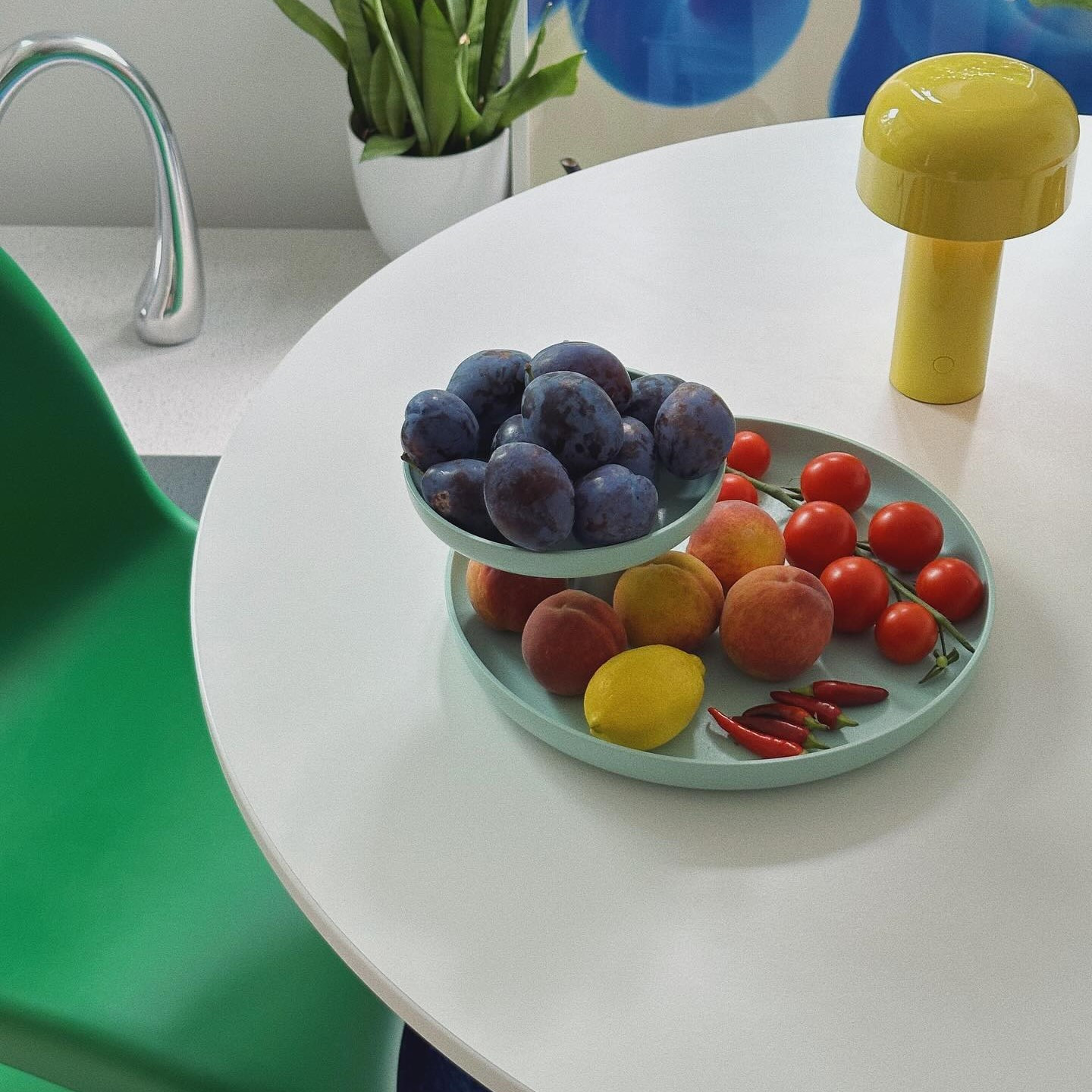 Otočný podnos je moderní interpretací klasického etageru odJaspera Morrisona pro značkuVitra. Díky svému elegantnímu, minimalistickému tvarua jemnými barvami se podnos skvěle hodí do každého stylu interiéru – odobývacího pokoje, ukoupelnyachodba, pofficenebodětský pokoj. Vyrobeno ztexturního ABS plastu,Otočný zásobník Uchvátí svou funkčností:horní úroveň se otáčíusnadňuje přístup k uloženým položkám. Lehký, praktický a odolnýDá se použít iobčas venkuv chráněných prostorách.