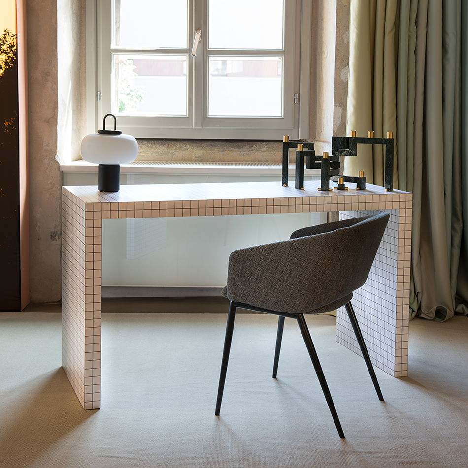 Moderní psací stůl z nejprodávanější kolekce Quaderna renomované italské značky Zanotta. Konstrukce tohoto luxusního kancelářského nábytku je vyrobena z bílého lamina s digitálním potiskem s černými čtverečky v rozestupech 3 cm. V horní části psacího stolu je výsuvná zásuvka s přepážkou z raženého dřeva odolného proti poškrábání.