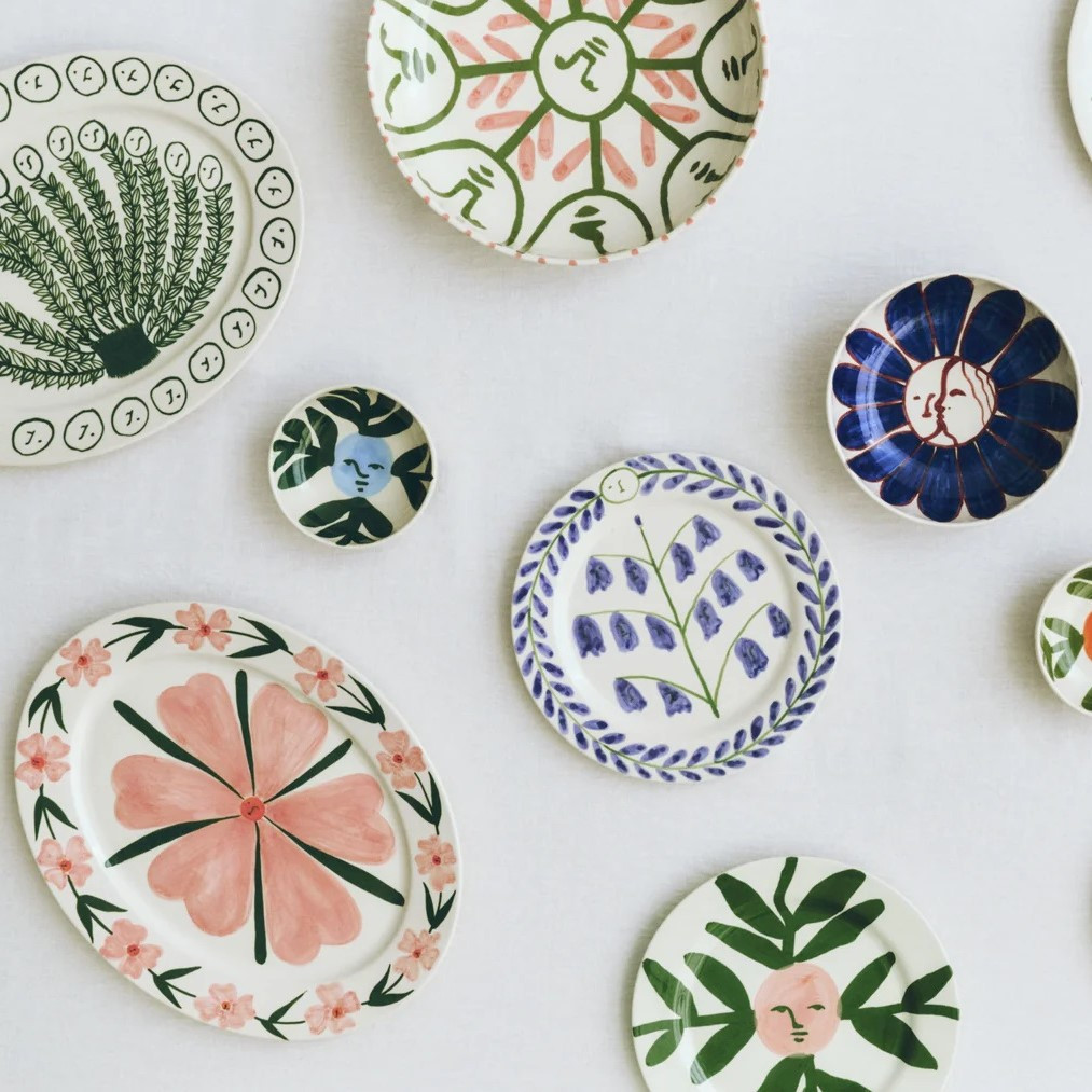 Každý talíř jeručně malovanýNeexistují dva stejné kusy. Model Moon Face Vine Uchvátí krémově béžovým základems motivy tváří a rostlin v Tontónech zelené, modré a jemné hnědé. Průměr28,5 cm Vy se hodí k večeři nebo jakodekorativní akcentna stůl nebo zeď.